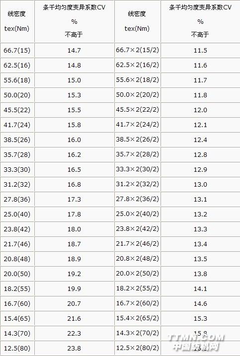 附录B(规范性附录)外观疵点说明及计量方法B.1 毛粒 纤维纠缠成的结点,直径粗于正常纱的2.5倍及以上,长度1mm及以上。B.2 竹节纱 连续出现节粗、节细的纱线,直径粗于正常纱的3倍及以上,长度2cm及以上。B.3 大肚纱 纱线局部直径粗于正常直径,呈枣核形,直径粗于正常纱的3.5倍及以上,长度大于5cm。B.4 粗节 纱线直径粗于正常纱的节段,直径粗于正常纱的2倍及以上,长度1cm~4cm为短粗节,4cm~8cm为长粗节,8cm以上为超长粗节。B.5 细节 纱线直径细于正常纱的节段,直径细于正常纱的0.5倍,长度小于8cm称短细节,8cm及以上称长细节。B.6 小辫纱、油污纱、多(缺)股纱、松紧纱、弓纱和双纱等 按GB/T 5706-1985中的3.2规定。附录C(规范性附录)精梳机织毛纱条干均匀度变异系数优等品考核指标 精梳机织毛纱条干均匀度变异系数优等品考核指标见表C.1。表C.1.jpg)