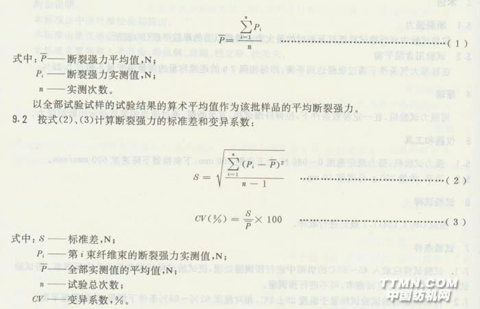 1主题内容与适用范围 本标准规定了黄、洋(红)麻束纤维断裂强力的试验方法。 本标准适用于黄、洋(红)麻束纤维断裂强力的测定。 2引用标准 GB8170数值修约规则 GB/T12411.1黄、洋(红)麻纤维试验取样方法 3术语 3.1断裂强力 拉伸试验中麻纤维试样抵抗至断时的最大力。单纯以力的单位牛顿(N)表示。 3.2试验用含湿平衡 在标准大气条件下通过吸湿达到平衡,即每相隔2h的连续称量的质量递变量不超过0.25%。 4原理 用强力试验机,在一定参数条件下,拉伸纤维试样,直至断裂,通过适当的装置指示出断裂强力。 5仪器和工具 5.1强力试验机:强力测定范围0~980N,上下夹距200mm,下夹持器下降速度600ram/rain。 5.2天平:称量200g,分度值10mg。 6试验试样 按照GB/T12411.1规定进行取样。 7试验条件 7.1试验试样应放入45~50℃的烘箱中进行预调湿处理,使试验试样回潮率低于公定回潮率。若试验试样回 潮率低于公定回潮率,可不进行预调湿。 7.2将预调湿后的试验试样置于温度20±2℃,相对湿度62%~68%条件下调湿,达到吸湿平衡。 7.5试验应在温度20±2℃,相对湿度62%~68%的大气条件下进行。 8试验方法 8.1仪器准备 将仪器调节至正常状态,使上下夹持器间的距离为200mm,并控制下夹持器的空载下降速度为600mm/min。 8.2试验步骤 8.2.1纤维束整理 将调湿平衡后的试验样品顺势理直,称取质量为lg的试验试样7~8个(其中试验仅用5个)。 8.2.2扎缚 用麻纤维在试验试祥一端距离50mm处扎缚。 8.2.3拉伸 8.2.3.1将试验试样扎缚的一端夹入上夹持器,夹入长度为50mm,下端用手拉直,并使试样同钳口的边成直角。拧紧下夹持器。不要用手触上、下夹持器之间的试样。 8.2.3.2启动